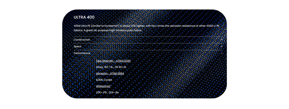 • Aer Ultra Series: The Ultra400X fabric used in the Aer Ultra series is crafted from 400D Ultra-PE fabric, a blend of high-strength polyester fibers, and laminated with Ultra-PE CrossPly. The fabric is backed by a 0.5mil thick film layer. Its tensile strength is 15 times that of steel, making it one of the strongest fibers commercially available today, with an extremely low density. This composite-enhanced material is designed for high-end lightweight outdoor gear, providing exceptional durability while maintaining minimal weight.