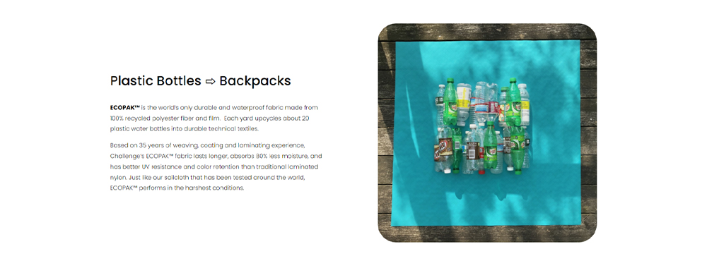 • The Tortuga Travel Backpack uses ECOPAK™ EPX200 waterproof fabric, a high-performance, eco-friendly material developed by Challenge Sailcloth. ECOPAK™ EPX200 is the world’s first composite fabric made from 100% recycled materials. Its structure consists of a 200D rPET outer layer, a 45° blue CrossPly reinforcement layer, a 70D tear-resistant lining, and a RUV™ recycled film backing. This laminated construction, combined with a water resistance of over 200+ PSI, ensures it meets heavy rain waterproofing needs. The 45° CrossPly reinforcement significantly enhances diagonal strength, reduces cutting waste, and prevents fabric distortion, making it an ideal material for travel optimization.