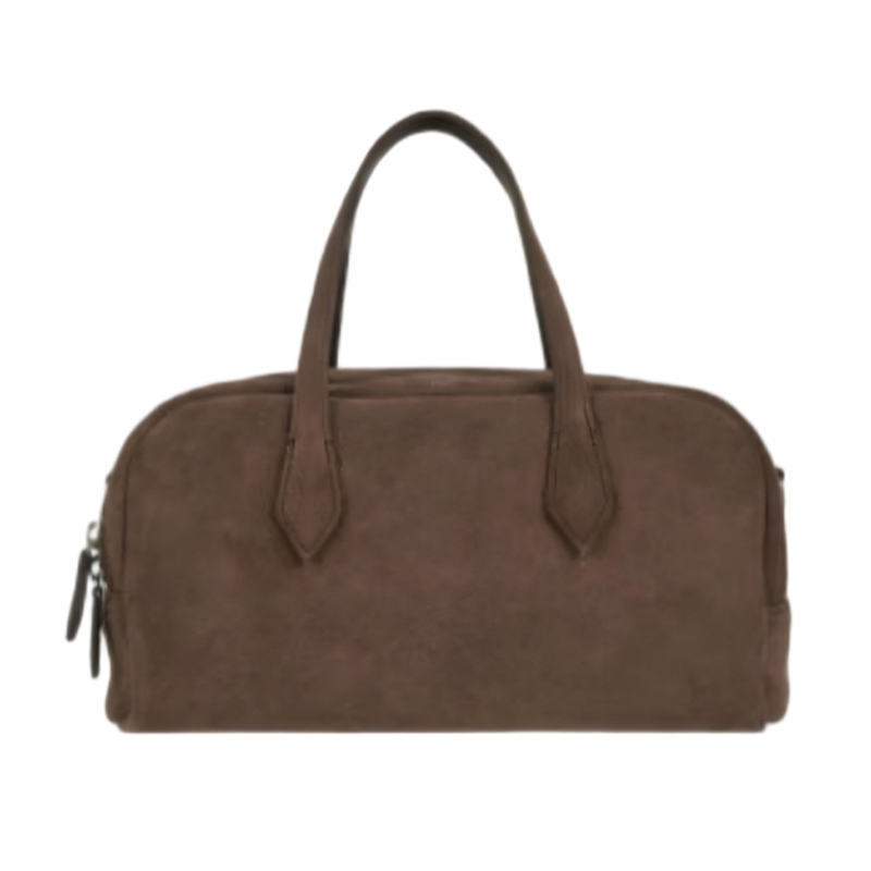 1.21 lbCrafted from soft brown suede, this handbag features a structured bowling bag design with two separate compartments, allowing for easy organization of your essentials. The sleek suede handles are integrated seamlessly with the body of the bag, while the leather shoulder strap offers an added option for a hands-free carry. When not in use, the leather strap can be detached, turning this functional piece into a refined hand-held tote.