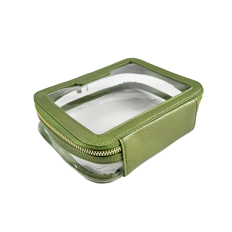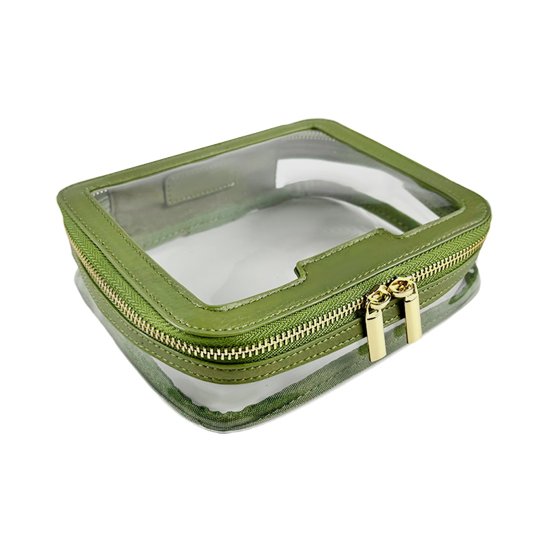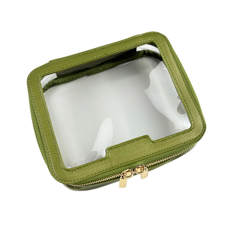 This makeup bag combines the richness of green litchi-pattern PU leather with the transparency of PVC, creating a chic and functional design. Paired with a luxurious gold zipper, this cosmetic pouch offers both style and convenience for everyday use or travel.