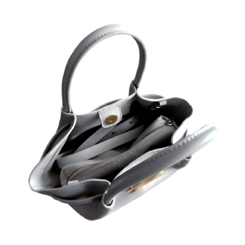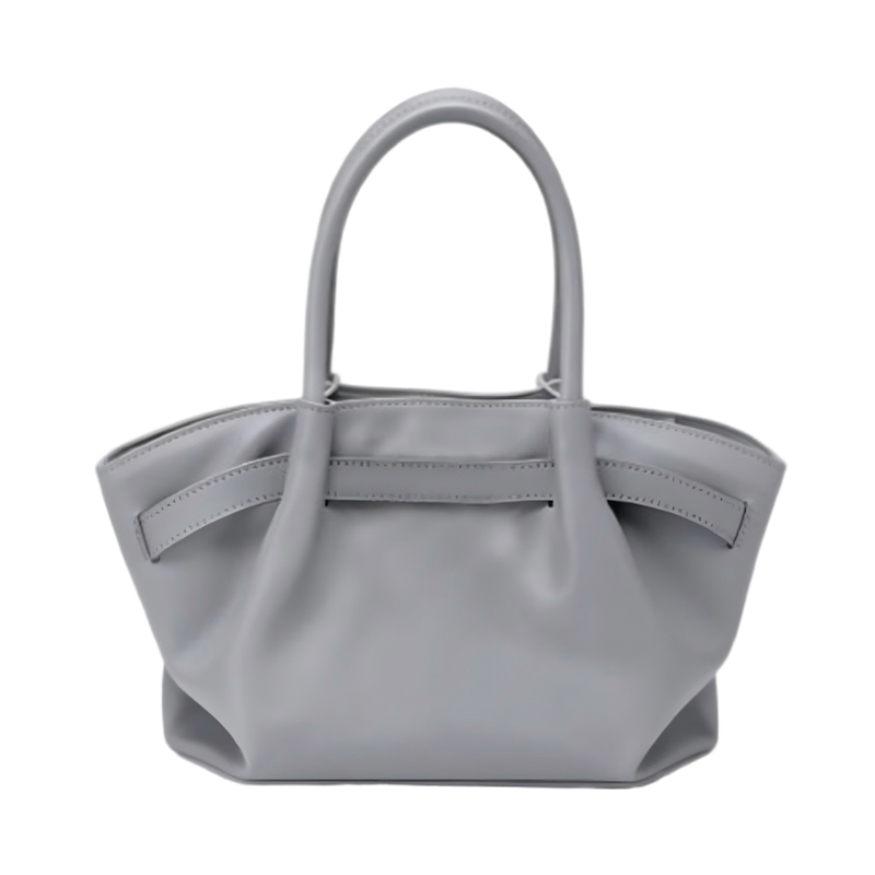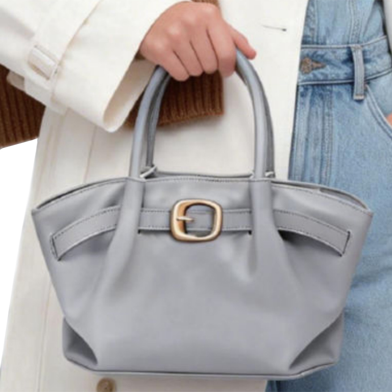 This small gray tote bag features a unique design that resembles a skirt, making it an ideal choice for fashion-forward women. The gold clasp adds a touch of elegance, elevating the bag's look while keeping it versatile enough for everyday use.