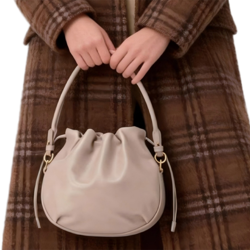 This chic small drawstring bag is crafted from high-quality leather, offering a blend of practicality and elegance. Its unique design allows it to transform from a compact hobo bag into a more open, spacious tote bag, making it a versatile accessory for women on the go.
