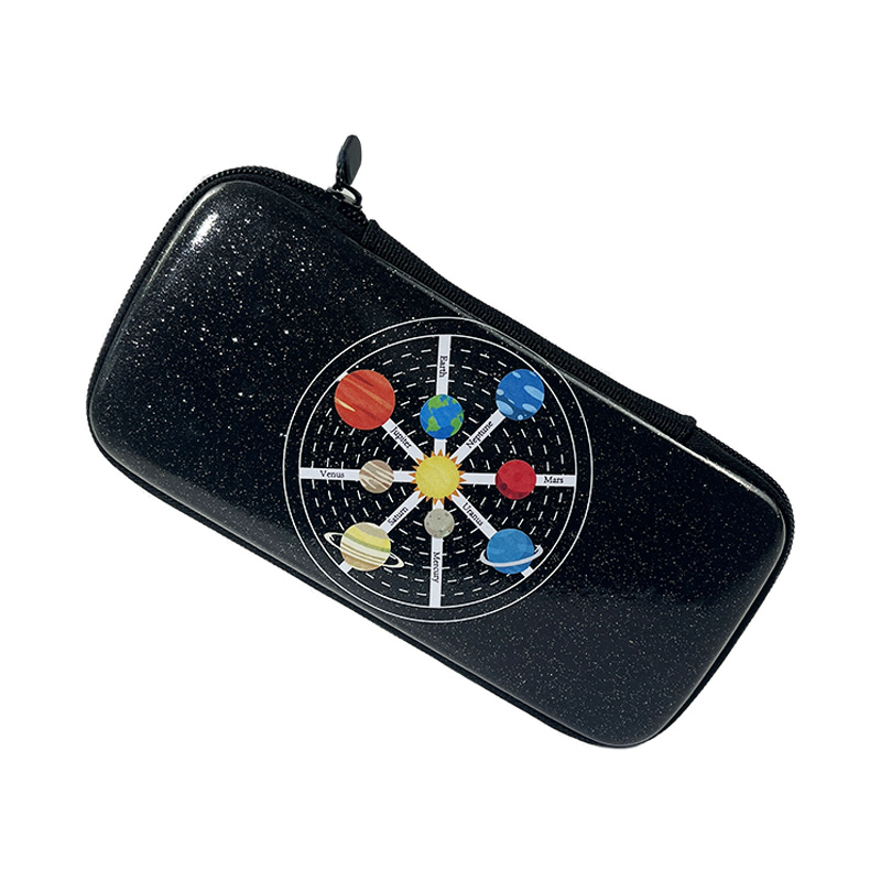 0.26 lbCrafted from durable EVA material, this black pencil case combines a sleek, protective structure with a shimmering black glitter PU exterior. The colorful planet print adds a fun, celestial touch, making this pencil box ideal for kids who are fascinated by space.