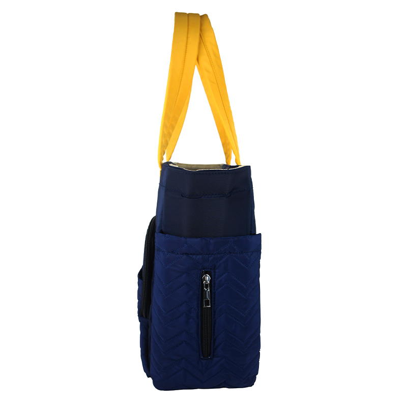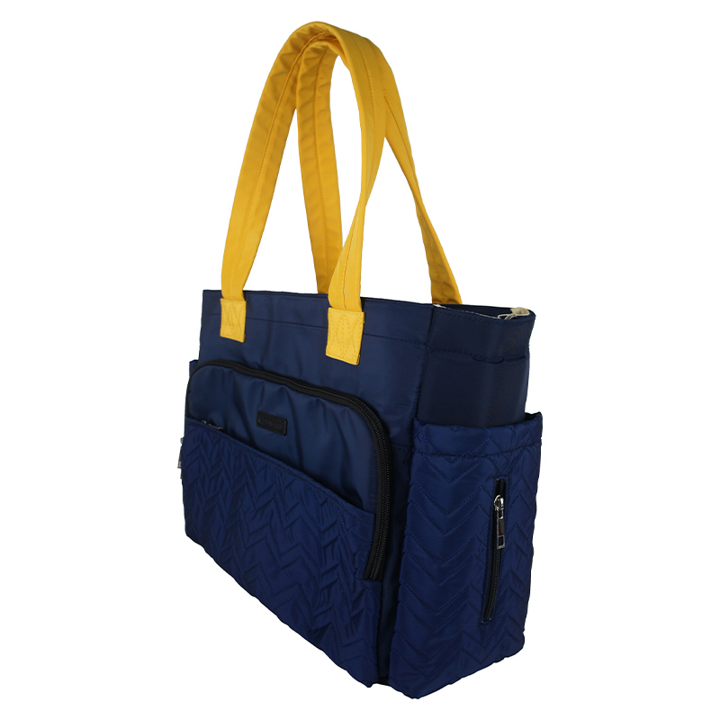 1.28 lbバッグ本体は、PUコーティングを施したネイビーブルーの平織りメモリーファブリックを採用。しっかりとした作りで、耐久性があり、お手入れも簡単です。ショルダーハンドルは、PUコーティングを施したオレンジの平織りメモリーファブリックを採用。ファッショナブルなカラーブロックのコントラストが、従来のベビーバッグとは一線を画す、洗練されたデザインです。