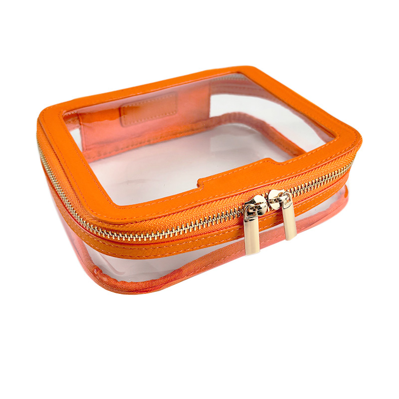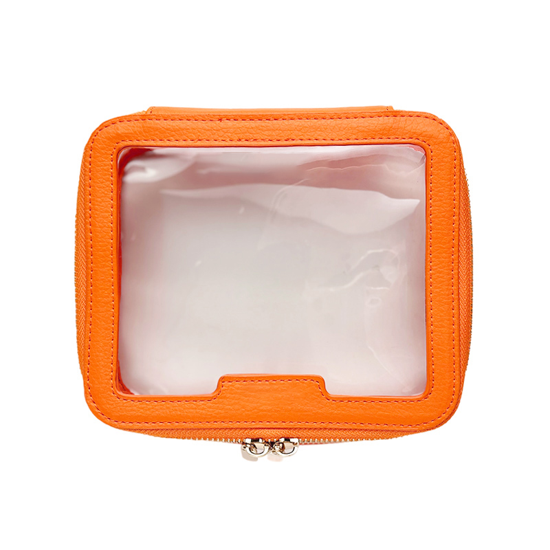 This makeup bag is designed with a modern, sleek look and made from bright orange PU leather combined with clear PVC material. The gold metal zipper adds a touch of luxury, making this cosmetic pouch a stylish and practical accessory for your beauty essentials.