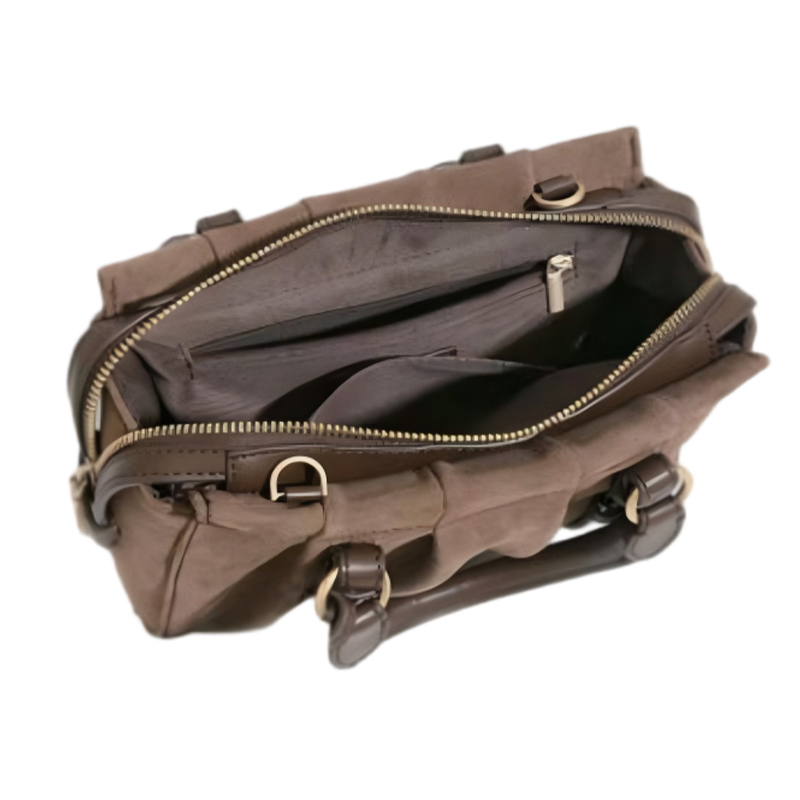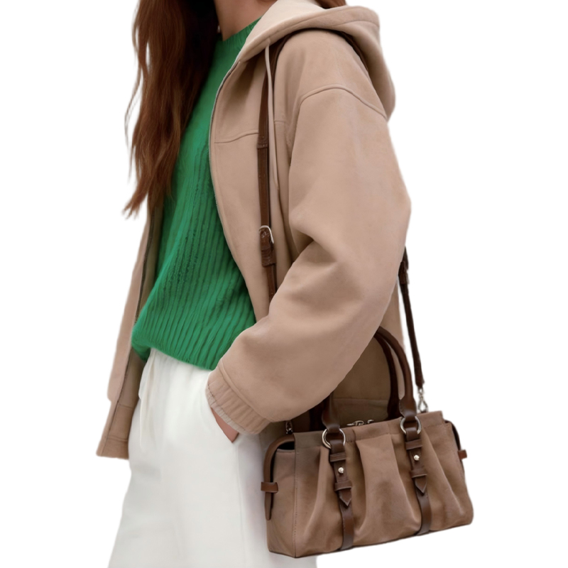 This sophisticated brown suede handbag combines classic design with unique pleated elements to create a timeless accessory. The intricate pleating adds texture and dimension, making it a standout piece in any collection of top handle handbags for women.