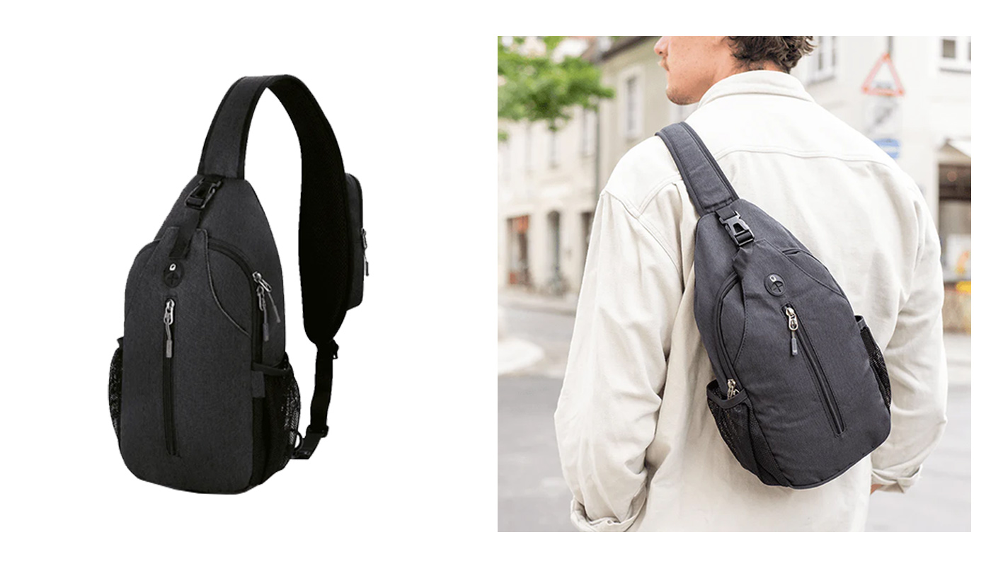 スリングバッグ 胸や背中に斜め掛けできる、ゆったりとしたバッグです。後ろ向きのスリングバッグよりも小さくて軽いのが特徴です。財布やメガネなどの小物を入れるのに十分なサイズです。